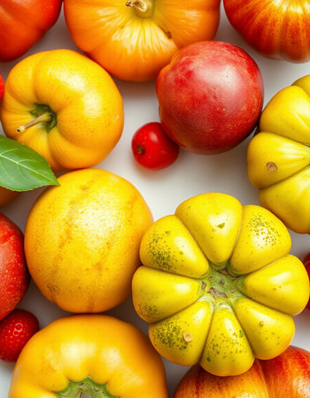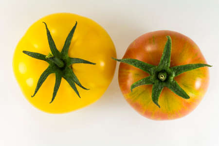 Healthy food composition of various fresh yellow and red tomato isolated on a white background. Vegetables, top view flat lay