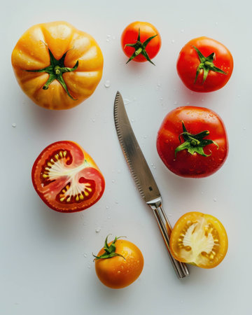 Freshly cut tomatoes on a white surface, showcasing vibrant colors and textures, with a knife placed nearby. Concept of healthy eating and culinary arts.