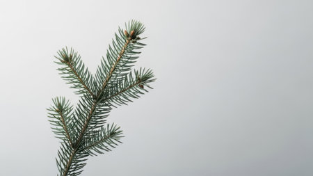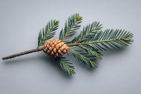 A fresh fir branch featuring a tiny pinecone is elegantly displayed on a minimalist gray background, capturing the spirit of the holiday season and nature's charm