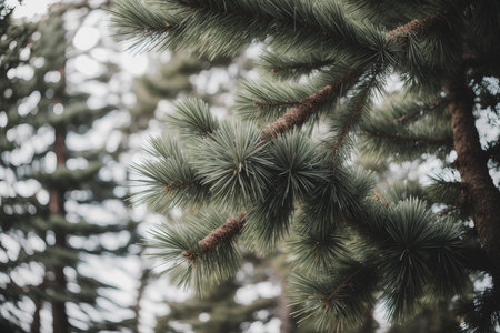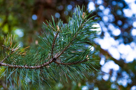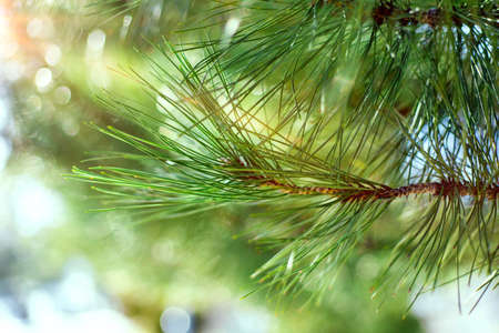 Pine tree branches and needles on blurred bokeh background