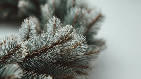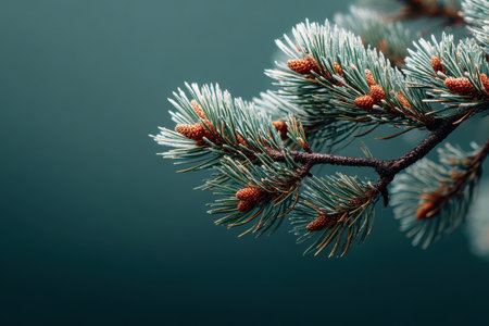 Detailed view of a pine branch showcasing frost and pine cones, set against a soft blurred backdrop, highlighting natural beauty and texture. Greeting card, copy space