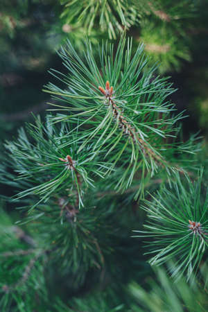 Green pine tree branches and needles close view with blurred natural background