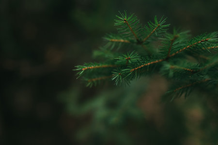 Branch of fir tree in the forest. Nature background with copy space.