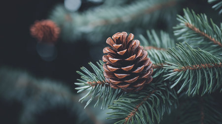 Frosted pine cone on a fir branch against a dark blurred background with soft light