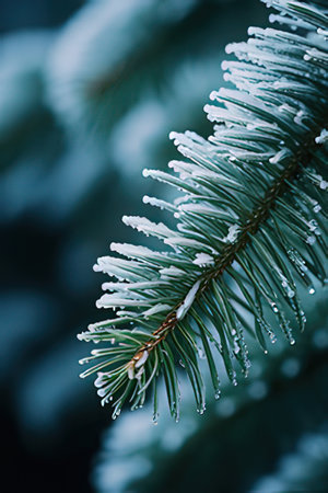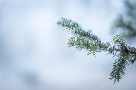 Christmas tree branches in hoarfrost with a blurred background.