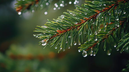 A vibrant close-up image showcasing a spruce tree branch adorned with glistening water drops, capturing the intricate details of nature's beauty in a tranquil setting.
