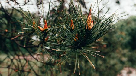 Branch of pine-tree with young cone and rain drops on needles on blurred background.