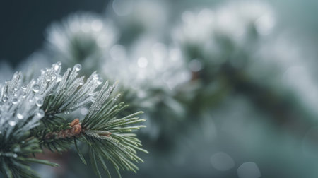 A highly detailed, closeup view of a vibrant green pine branch that is beautifully adorned with glistening dew drops, showcasing the serene beauty of nature and its tranquil charm