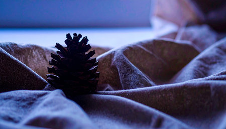Realistic single natural brown pine cone placed on soft wrinkled beige linen fabric with natural diffused light, minimal calm composition