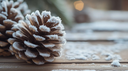 Snow-covered pine cones rest on a textured wooden base, creating a serene winter atmosphere. The snow adds a delicate touch to the natural elements, showing seasonal beauty.