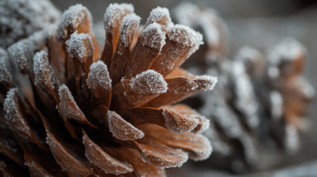 Close-up of frosty pine cones with a backdrop of softly blurred winter woodland