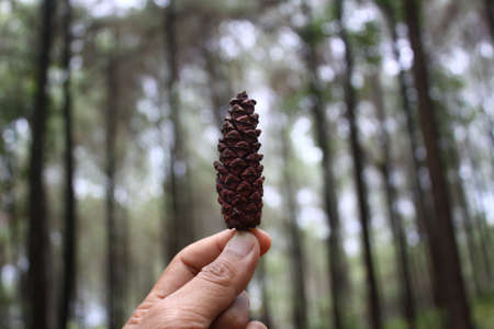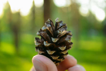 Male fingers holding a pine cone close up in bokeh