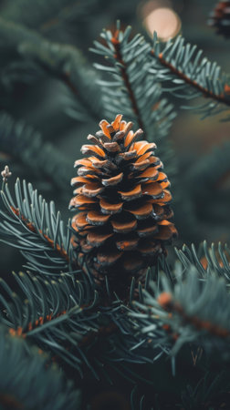 Frosted pine cone on a fir branch against a dark blurred background with soft light