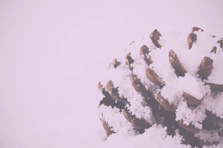 Pine cone covered in soft white fluffy snow Vintage Retro Filter.