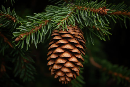 A close-up of an evergreen tree's pine cone, showcasing the intricate details and textures that make it unique among other coniferous trees. The background is dark to highlight the brownish-green color of the cones against the green branches. --ar 3:2 --v 6.1 Job ID: 8262abeb-b8d9-41e5-be42-2b25698b9779