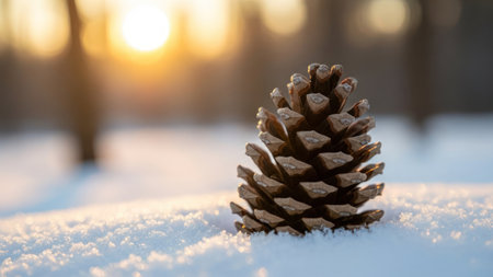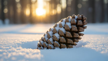 A close-up view displays a pine cone resting in fresh snow with a blurred background. The natural textures of the pine cone contrast against the soft, white snow. Sunlight gently illuminates the scene creating a warm aesthetic. The natural elements create a peaceful environment.