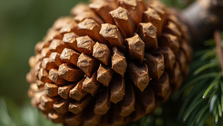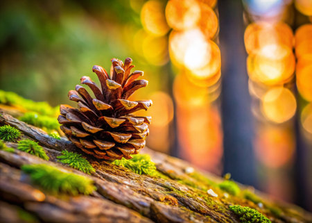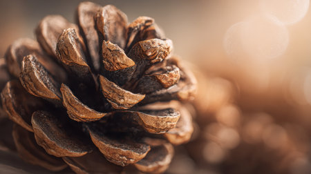 A close-up shot of a rugged brown pine cone showcases intricate scales and earthy tones, surrounded by a warm, gentle blur that evokes autumn's comforting embrace.