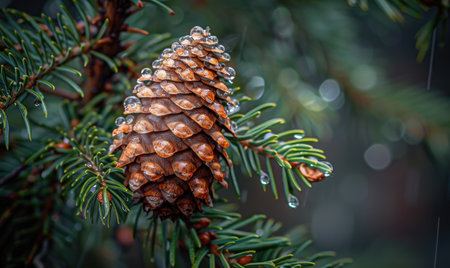 A rainsoaked pinecone on a branch, showcasing how rain revitalizes nature.