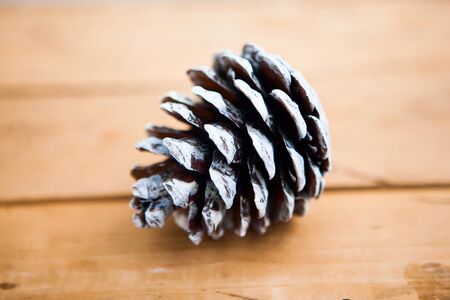 Frosted Pine Cone on Wooden Table Close-Up