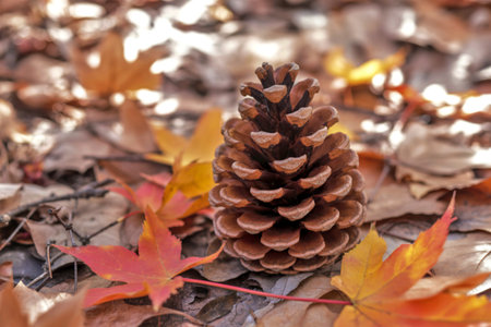 Autumn pine cone among colorful maple leaves
