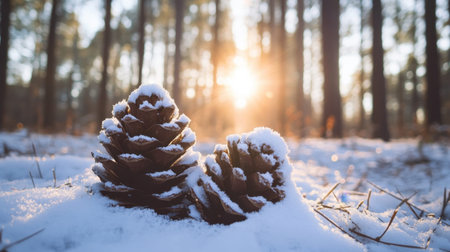 A serene winter scene featuring two snow-covered pine cones nestled in a snowy forest, illuminated by the warm glow of sunrise, surrounded by tall trees.