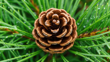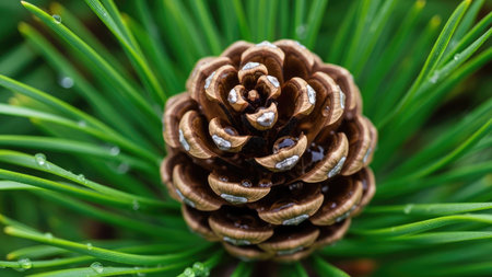 A detailed image showcases a single brown pine cone surrounded by bright green needles. The composition highlights the textures and patterns of the cone against the backdrop of the foliage. The lighting suggests an outdoor setting. Suitable for various projects, including nature-themed content and editorial use.