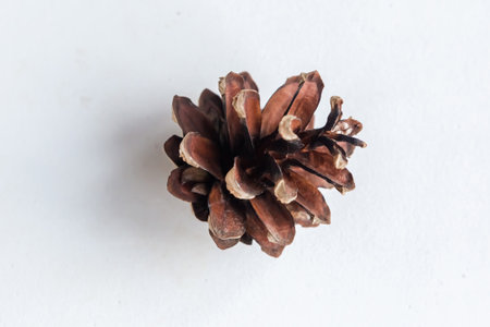 Pinus, dry pine cones on white background. Copy space, selective focus.