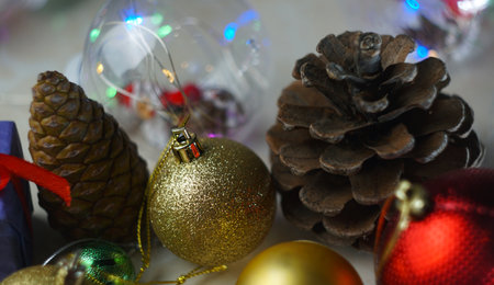 A visually appealing arrangement of decorative Christmas ornaments and pine cones, perfect for enhancing festive holiday celebrations and winter decor.