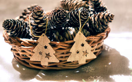Wooden Christmas trees toys and wicker basket with cones. Christmas still life. Rustic style