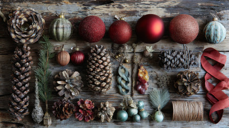 Captivating assortment of festive decorations featuring natural elements like pinecones and ornaments on a rustic wood background, perfect for holiday themes.