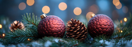 This captivating image features a blend of elegant holiday decorations, including glittering ornaments and natural pine cones, creating a festive atmosphere.