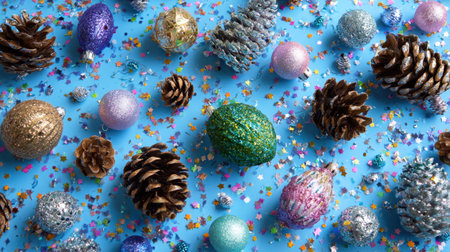 Celebrate the holiday season with this vibrant arrangement of colorful decorations, pine cones, and glitter on a cheerful blue background, perfect for festive designs.