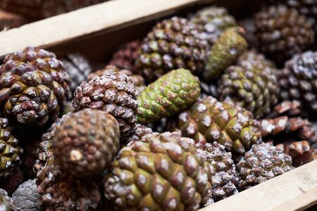 Cozy background of pine cones. Autumn mood brown backdrop. Fir bumps pattern