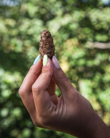 woman left hand holds dried pine cone in the green pine forest in the North of Thailand