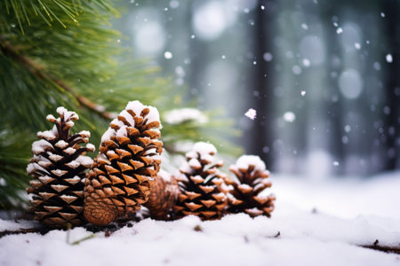 Photography captures snow-laden pine branches with frost, contrasted by a rich green background, evoking a tranquil winter atmosphere with copy space for text