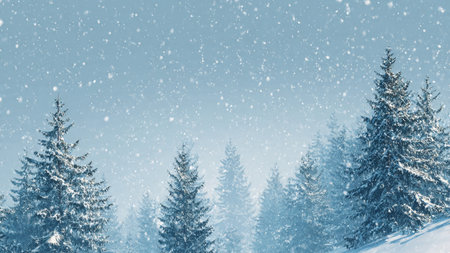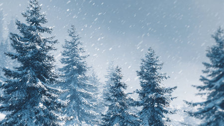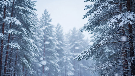 Blurred snowy pine forest with falling snowflakes, capturing the quiet beauty of winter's natural landscape