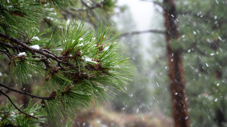 First snow falling gently on Ponderosa pine, a few snowflakes drifting slowly and settling on the leaves; fresh air.