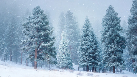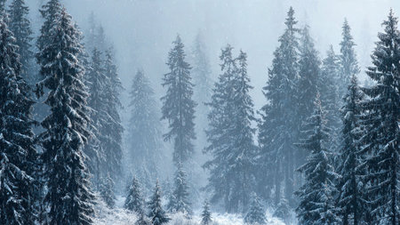 Discover the beauty of a winter wonderland, featuring snow-covered pine trees shrouded in mist, creating a serene and tranquil atmosphere in nature.