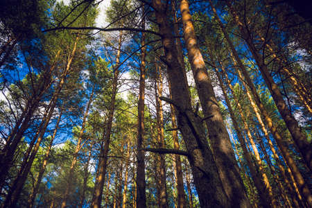 Bottom view of tall old trees in pine forest.Low angel shot of a tranquil pine forest, in morning