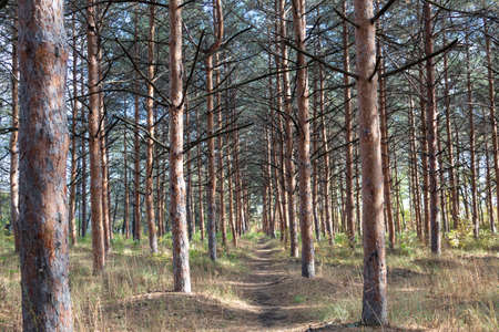 Beautiful landscape of pine forest in summer day. The tall trees of the pine trees growing in the old forest.