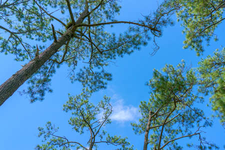 forest of nature fir leaf tree in wildlife on summer blue sky background, vacation holiday and travel to natural environment park