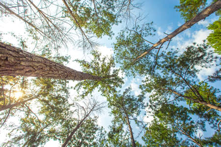 Bottom view of trunks trees in a pine forest.