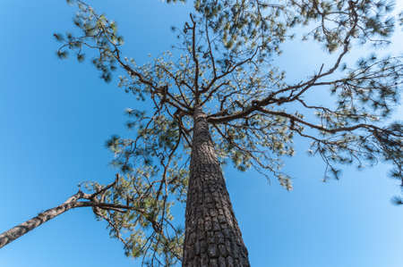 Looking up on pine tree focus on the bark of the tree