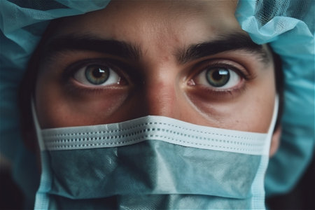 Close up of male doctor eyes and face in protect mask. Generative AI.