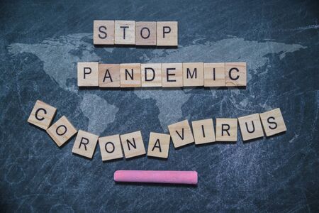 STOP pandemic corona virus word written wood block. on black board with world map chalk written for your desing, top view.