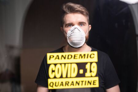 Coronavirus, quarantine, covid-19 and pandemic concept. Sad and sick man of corona virus looking through the window. Stay at home.