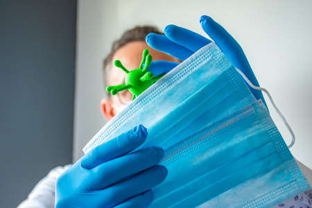Scientist or doctor holds figure of virus in one hand, with other hand covers this pathogen with help of protective face masks. Concept photo for prevention of airborne transmission of diseases