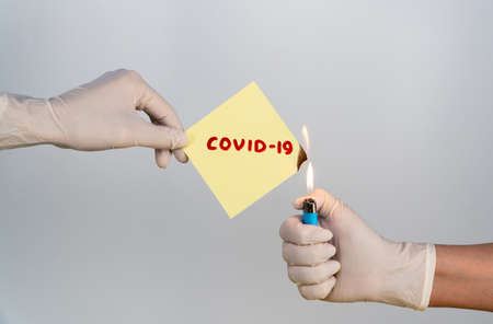 piece of paper with the inscription covid is burning with fire. Paper with text in hand with a medical glove. defeating the coronavirus. end of the pandemic.