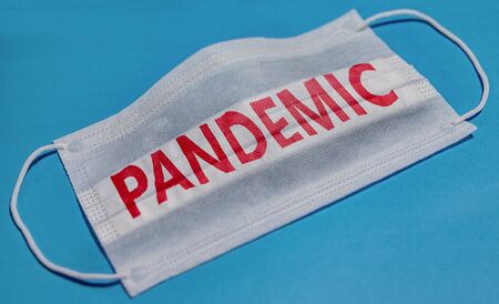 Medical face mask with PANDEMIC text on blue background. Concept of coronavirus quarantine.