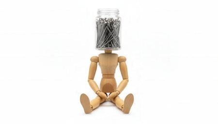 Wooden mannequin seated with a jar filled with nails replacing its head, placed against a plain white background. Represents creativity, abstract art, and unique ideas.